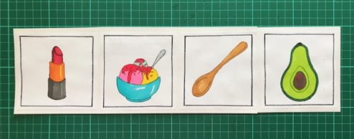 Search the house and find and draw objects that begin with the letters in your name. So my objects are a lipstick, ice cream, spoon and avocado.